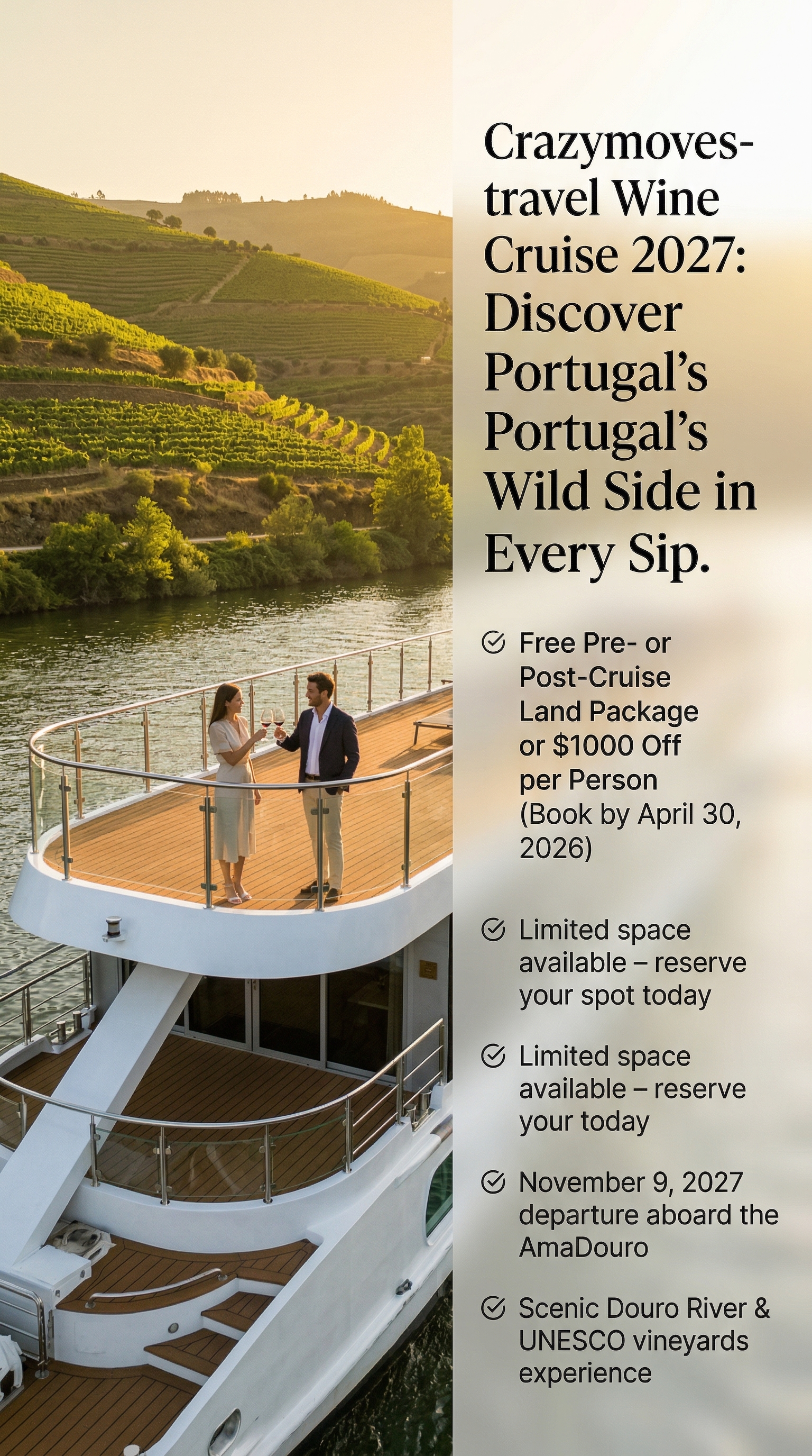 Ready to reserve your spot for this Portugal wine cruise in 2027? Reach out to Crazy Moves Travel for current availability and cabin options.